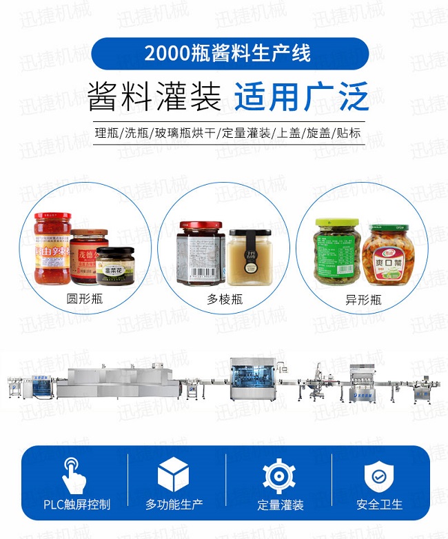 牛肉顆粒醬各種各樣的包裝方式在我們的生活中并不少見,隨著牛肉顆粒醬灌裝豐富化時代的到來,那么針對這么多包裝需求只要選擇這款全自動牛肉顆粒醬灌裝機設(shè)備就可以輕松的去實現(xiàn)多樣化的包裝方法,具備無滴漏灌裝;管道采用快裝式鏈接,完全符合衛(wèi)生要求,拆洗維護方便;全自動牛肉顆粒醬灌裝機設(shè)備還保障了瓶口干凈衛(wèi)生,輸送帶干凈衛(wèi)生,符合GMP標準有著操作調(diào)節(jié)便利,無瓶不灌裝,自動檢測,計數(shù)等一些類比較出色的優(yōu)勢特點,迅捷機械可根據(jù)客戶需求配理瓶機、旋蓋機,貼標機,打碼機等設(shè)備來實現(xiàn)自身企業(yè)的實際生產(chǎn)需求。
